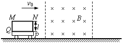4、计算题 如图所示,在质量为M=0.99kg的小车上,固定着一个质量为m=10g、电阻R=1Ω的矩形单匝线圈MNPQ,其中MN边水平,NP边竖直,高度l=0.05m。小车载着线圈在光滑水平面上一起以v0=10m/s的速度做匀速运动,随后进入一水平有界匀强磁场(磁场宽度大于小车长度),完全穿出磁场时小车速度v1=2m/s。磁场方向与线圈平面垂直并指向纸内、磁感应强度大小B=1.0T。已知线圈与小车之间绝缘,小车长度与线圈MN边长度相同。求: