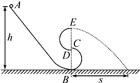 1、简答题 如图所示,粗糙弧形轨道AB和两个光滑半圆轨道组成翘尾巴的S形轨道.光滑半圆轨道半径为R,两个光滑半圆轨道连接处CD之间留有很小空隙,刚好能够使小球通过,CD之间距离可忽略.粗糙弧形轨道最高点A与水平面上B点之间的高度为h从A点静止释放一个可视为质点的小球,小球沿翘尾巴的S形轨道运动后从E点水平飞出,落到水平地面上,落点到与E点在同一竖直线上B点的距离为s.已知小球质量m,不计空气阻力,求: