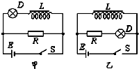 5、选择题 如图所示,在甲、乙两电路中,电阻R和自感线圈L的电阻值都很小.接通S,使电路达到稳定,灯泡D发光,则( )
