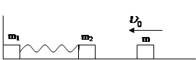 1、计算题 如图,质量为m1=1kg,m2=4.5kg的两个小滑块固定在轻质弹簧两端,静止于光滑水平面上,m1靠在光滑竖直墙上。现在一质量为m=0.5kg的小滑块,以
