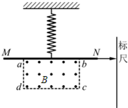 ![]() 4、选择题 法拉第曾做过如下的实验:在玻璃杯侧面底部装一导体柱并通过导线与电源负极相连,直立的细圆柱形磁铁棒下端固定在玻璃杯底部的中心,往杯内加入水银,在玻璃杯的正上方O点吊一可自由摆动或转动的直铜棒,铜棒的上端与电源的正极相接,下端浸入玻璃杯中的水银中。由于水银的密度比铜大,铜棒会倾斜地与水银相连,此时铜棒静止,如图所示。这样,直铜棒、水银、导电柱和电源就构成了一个回路。闭合开关S,则该实验可观察到的现象是 5、填空题 某同学自制一电流表,其原理如图所示.质量为m的均匀细金属杆MN与一竖直悬挂的绝缘轻弹簧相连,弹簧的劲度系数为k,在矩形区域abcd内有匀强磁场,磁感应强度大小为B,方向垂直纸面向外.MN的右端连接一绝缘轻指针,可指示出标尺上的刻度.MN的长度大于ab,当MN中没有电流通过且处于静止时,MN与矩形区域的ab边重合,且指针指在标尺的零刻度;当MN中有电流时,指针示数可表示电流强度.MN始终在纸面内且保持水平,重力加速度为g. |