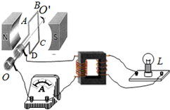 3、简答题 如图所示,一矩形导线框ABCD处于水平匀强磁场中绕垂直于磁场的轴OO′匀速转动,线框ABCD的输出端通过电刷与电流表、理想变压器原线圈相连,副线圈两端接有一只“18V、12W”的灯泡L.当线框ABCD转速n=50r/s时,灯泡L正常发光,此时电流表示数为0.2A.