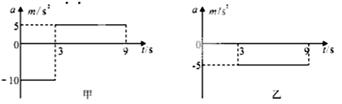 1、选择题 受沿线焚烧秸杆产生烟雾影响,高速发生多起多车辆追尾事故。假设髙速公路上甲、乙两车在同一车道上同向行驶.甲车在前.乙车在后.速度均为 v0=30m/s.距离s0 = l00m.t=0时刻甲车遇紧急情况后,甲、乙两车的加速度随时间变化如图所示.取运动方向为正方向.下面说法错误的是(?)