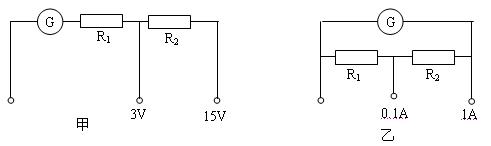 4、计算题 某电流表表头内阻Rg为200Ω,满偏电流Ig为2mA,按图甲改装成量程为3V和15V的电压表,按图乙改装成量程为0.1A和1A的两个电流表,试求两种情况下的R1和R2各为多少?