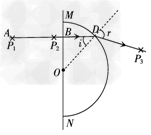 参考答案:据题,三棱镜由主截面是等边三角形,由几何知识得,光线射到AC面上时的入射角i=60°. 本题解析: 本题难度:一般 4、实验题  利用插针法可以测量半圆柱形玻璃砖的折射率。实验方法如下:在白纸上作一直线MN,并作出它的一条垂线AB。将半圆柱形玻璃砖(底面的圆心为O)放在白纸上,它的直径与直线MN重合。在垂线AB上插两个大头针P1和P2(如图),然后在半圆柱形玻璃砖的右侧插上适量的大头针,可以确定光线P1P2通过玻璃砖后的光路,从而求出玻璃的折射率.实验室中提供的器材除了半圆柱形玻璃砖、木板和大头针外,还有量角器等. 参考答案:(1)光线P1P2垂直于界面进入半圆柱形玻璃砖后到达圆弧面MN上发生全反射现象;向上 本题解析: 本题难度:一般 5、选择题  折射率 参考答案:B 本题解析: 本题难度:一般 |