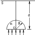 3、简答题 一束截面为圆形(半径为R)的平行单色光正面射向一玻璃半球的平面,如图所示,经折射后在屏S上形成一圆形光斑.已知入射光的波长为λ、功率为P,玻璃半球的半径为R,折射率为n,屏S?到球心O的距离为d(d>3R). (1)从O点射入玻璃砖的光线要多长时间能到达屏S? (2)光从圆弧面上什么范围射出? (3)屏S上光斑的半径为多大?