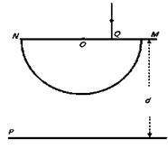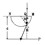 2、计算题 如图所示,一玻璃砖的横截面为半圆形,MN为截面的直径,Q是MN上的一点且与M点的距离QM=R/2 (R为半圆形截面的半径与水平光屏P平行,两者的距离为d,一束与截面平行的红光由 Q点沿垂直MN的方向射入玻璃砖,从玻璃砖的圆弧面射出后,在光屏上得到红光。玻璃砖对该红光的折射率为n= ,求: