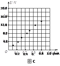 ③由实验测得的7组数据已在图C的U-I图上标出,请你完成图线,并由图线求出R="_______" Ω. (结果保留三位有效数字)