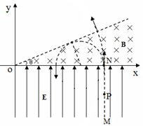 4、计算题 (16分)如图所示,在xoy平面的第四象限内存在沿y轴正方向的匀强磁场,场强大小为E,第一象限存在一有界匀强磁场,方向垂直于xoy平面向里,磁感应强度为B,磁场上边界与x轴正向夹角θ=30°,直线MN与y轴平行,N点坐标为(L,0),现从MN上的P点无初速度释放质量为m,电荷量为q的带正电粒子,不计粒子的重力,求: