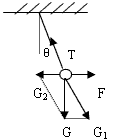 1、计算题 如图所示,一根细线上端固定,下端拴着一个重量为G的小球,静止时细线保持竖直。现给小球一个水平向右的拉力F,把小球拉到某个位置静止。若当细线与竖直方向的夹角为θ时,水平拉力的大小为F,细线对小球的拉力为T。求F与T。