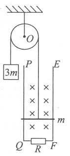 2、选择题 如图所示,一定滑轮上绕有轻质柔软细线,线的一端系一质量为3m的重物,另一端系一质量为m、电阻为r的金属杆。在竖直平面内有间距为L的足够长的平行金属导轨PQ、EF,在QF之间连接有阻值为R的电阻,其余电阻不计,磁感应强度为B0的匀强磁场与导轨平面垂直。开始时金属杆置于导轨下端QF处,将重物由静止释放,当重物下降h时恰好达到稳定速度而匀速下降。运动过程中金属杆始终与导轨垂直且接触良好,(忽略摩擦阻力,重力加速度为g),则