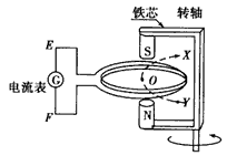 2、选择题 图为一种早期发电机原理示意图,该发电机由固定的圆形线圈和一对用铁芯连接的圆柱形磁铁构成,两磁极相对于线圈平面对称。在磁极绕转轴匀速转动过程中,磁极中心在线圈平面上的投影沿圆 弧XOY运动(O是线圈中心),则