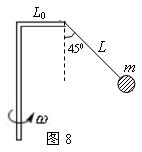 4、计算题 (10分)如图8所示的结构装置可绕竖直轴转动,假若细绳长L=0.2m,水平杆长L0=0.1m,小球的质量m=0.3kg.求: