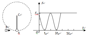 3、计算题 如图所示为一根竖直悬挂的不可伸长的轻绳,下端拴一小物块A,上端固定在C点且与一能测量绳的拉力的测力传感器相连.已知有一质量为m0的子弹B沿水平方向以速度v0射入A内(未穿透),接着两者一起绕C点在竖直面内做圆周运动,在各种阻力都可忽略的条件下测力传感器测得绳的拉力F随时间t的变化关系如图2所示.已知子弹射入的时间极短,且图2中t=0为A、B开始以相同速度运动的时刻,求(1)子弹和物块一起做圆周运动的周期T(2)绳子的长度L(3)子弹和物块一起运动时的机械能E