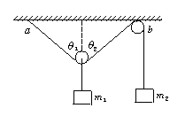 4、选择题 如图所示装置中,两物体的质量分别为m1、m2,轻绳先后绕过挂有m1的动滑轮和定滑轮b,悬点a与定滑轮b左边缘间的距离大于动滑轮的直径,不计一切摩擦,若装置处于静止状态,则