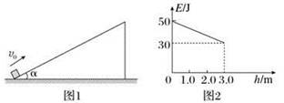 4、选择题 如图1所示,物体以一定的初速度从倾角α=37°的斜面底端沿斜面向上运动,上升的最大高度为3.0 m.选择地面为参考平面,上升过程中,物体的机械能E随高度h的变化如图2所示.g=10 m/s2,sin37°=0.60,cos37°=0.80.则
