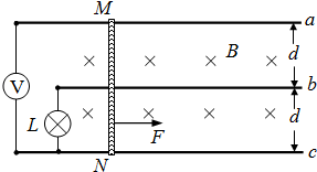 5、填空题 如图所示,水平设置的三条光滑平行金属导轨a、b、c位于同一水平面上,a与b、b与c相距均为d=1m,导轨ac间横跨一质量为m=1kg的金属棒MN,棒与三条导轨垂直,且始终接触良好.棒的电阻r=2Ω,导轨的电阻忽略不计.在导轨bc间接一电阻为R=2Ω的灯泡,导轨ac间接一理想电压表.整个装置放在磁感应强度B=2T的匀强磁场中,磁场方向垂直导轨平面向下.现对棒MN施加一水平向右的拉力F,使棒从静止开始运动.若施加的水平外力功率恒定,且棒达到稳定时的速度为1.5m/s,则水平外力的功率为______W,此时电压表读数为______V.