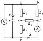 2、填空题  如图所示的电路中,电阻R1=12Ω,R2=R3=R4=6.0Ω.当电键S断开时,电压表的示数为12V,全电路消耗的电功率为13W.若电流表、电压表均为理想电表,则电源的电动势为______.当电键S闭合后,则电压表的示数为______.