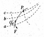 ![]() 参考答案:A 本题解析: 本题难度:简单 2、选择题 如右图所示,虚线a、b、c代表电场中的三个等势面,相邻等势面之间的电势差相等,即Uab=Ubc,实线为一带正电的点电荷仅在电场力作用下通过该区域时的运动轨迹,P、Q是这条轨迹上的两点,据此可知下列说法错误的是(?) 参考答案:C 本题解析:等差等势面密集的地方场强大,稀疏的地方场强小,由图纸P点的场强大,则质点通过P点时的加速度大。故选项D对。根据电场线与等势面垂直,定性画出过P、Q两点的电场线。假设质点从Q向P运动,根据初速度的方向和轨道偏转方向可判定质点在Q点所受电场力F的如图所示。可以判断出等势面C的电势高。选项A正确。由Q向P运动过程中,电场力做负功,动能减少,电势能增加。故选项B对C错。若质点从P向Q运动,也可得出选项B正确。 本题难度:简单 3、选择题 如图所示,在匀强电场中有一平行四边形ABCD,已知A、B、C三点的电势分别为φA=10V、φB=8V、φC=2V,则D点的电势为