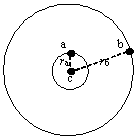 5、填空题 如图,三个质点a、b、c质量分别为m1、m2、M(M>>m1,M>>m2),在c的万有引力作用下,a、b在同一平面内绕c沿逆时针方向做匀速圆周运动,轨道半径之比为ra:rb=1:4,则它们的周期之比Ta:Tb=__________,从图示位置开始,在b转动一周的过程中,a、b、c共线有__________次。