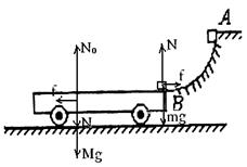 1、计算题 一个平板小车置于光滑水平面上,其右端恰好和一个1/4光滑圆弧轨道AB的底端等高对接,如图所示。已知小车质量M=2kg,小车足够长,圆弧轨道半径R=0.8m。现将一质量m=0.5kg的小滑块,由轨道顶端A点无初速释放,滑块滑到B端后冲上小车。滑块与小车上表面间的动摩擦因数μ=0.2,g取10m/s2。求: