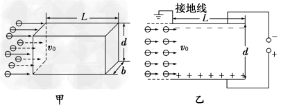 1、计算题 如图甲所示,静电除尘装置中有一长为L、宽为b、高为d 的矩形通道,其前、后面板使用绝缘材料,上、下面板使用金属材料。图乙是装置的截面图,上、下两板与电压恒定的高压直流电源相连。质量为m、电荷量为-q、分布均匀的尘埃以水平速度v0进入矩形通道,当带负电的尘埃碰到下板后其所带电荷被中和,同时被收集。通过调整两板间距d可以改变收集频率η。当d=d0时,η为81%(即离下板0.81d0范围内的尘埃能够被收集) 。不计尘埃的重力及尘埃之间的相互作用。