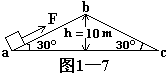 1、计算题 如图1—7所示,质量为20 kg的物体受到一个始终与路面平行的力F的作用,沿abc路径匀速地通过一座高为10 m的小山坡,物体与路面间的摩擦力始终为20 N。求作用力F将物体从a匀速地达到C所做的总功为多少?