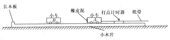 2、实验题 某同学设计了一个用打点计时器做“探究碰撞中的不变量”的实验:在小车A的前端粘有橡皮泥,推动小车A使之做匀速运动,然后与原来静止在前方的小车B相碰并粘合成一体,继续做匀速运动.他设计的具体装置如下图所示,在小车A后连着纸带,电磁打点计时器电源频率为50 Hz,长木板下垫着小木片用以平衡摩擦力。