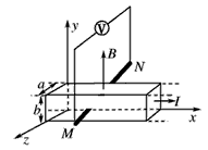 2、选择题 目前有一种磁强计,用于测定地磁场的磁感应强度。磁强计的原理如图所示,电路有一段金属导体,它的横截面是宽为a、高为b的长方形,放在沿y轴正方向的匀强磁场中,导体中通有沿x轴正方向、大小为I的电流。已知金属导体单位体积中的自由电子数为n,电子电荷量为e,金属导电过程中,自由电子所做的定向移动可视为匀速运动。两电极M、N均与金属导体的前后两侧接触,用电压表测出金属导体前后两个侧面间的电势差为U。则磁感应强度的大小和电极M、N的正负为