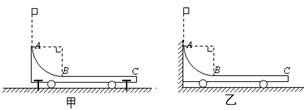现去掉钉子(水平面依然光滑未被破坏)不固定小车,而让其左侧靠在竖直墙壁上,该物块仍从原高度处无初速下落,如乙图所示。