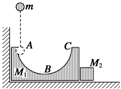 5、选择题  如图所示,将质量为M1,半径为R且内壁光滑的半圆槽置于光滑水平面上,左侧靠墙角,右侧靠一质量为M2的物块.今让一质量为m的小球自左侧槽口A的正上方h高处从静止开始落下,与圆弧槽相切自A点进入槽内,则以下结论中正确的是(  )