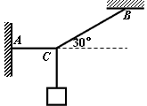 4、计算题 如图,在细绳C点系一重物G,细线两端A、B分别固定在墙上,使得AC保持水平,BC与水平方向成30°角,已知细绳最多只能承受200N的拉力,那么在C点悬挂物的重力最多为多少?
