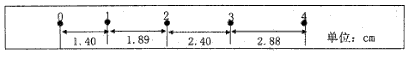 4、实验题 如图所示为某物理实验小組在一次探究力和加速度关系的实验中获取的一条纸带的一部分,其中0、1、2、3、4为计数点,每相邻两计数点间还有4个点未标出,相邻计数点间的距离如图所示。实验中打点计时器使用的交流电源的频率为50 Hz,根据图中数据计算出物体运动的加速度g=_____m/s2(保留三位有效数字)。