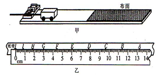 5、实验题 (10分)图甲所示是用打点计时器记录小车运动情况的装置,开始时小车在水平玻璃板上匀速运动,后来在薄布面上做匀减速运动,所打出的纸带如图乙所示(附有刻度尺).纸带上相邻两点对应的时间间隔为0.02 s.
