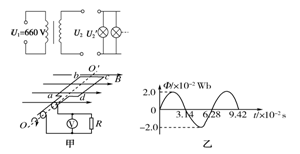 4、计算题 在下图中,降压变压器的变压系数是3,即初级线圈匝数与次级线圈的匝数之比是3∶1.初级线圈的输入电压是660 V,次级线圈的电阻为0.2 Ω,这台变压器供给100盏(220 V,60 W)的电灯用电.求: