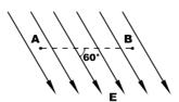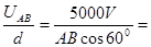 2、计算题 (8分)如图所示,在匀强电场中,有A、B两点,它们间距为2cm,两点的连线与场强方向成60°角。将一个电量为?2×10?5C的电荷由A移到B,其电势能增加了0.1J。则: