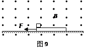 1、选择题 如图9所示,空间有一垂直纸面向外的磁感应强度为0.5T的匀强磁场,一质量为0.2kg且足够长的绝缘塑料板静止在光滑水平面上。在塑料板左端无初速度放置一质量为0.1kg、带电荷量为+0.2C的滑块,滑块与绝缘塑料板之间的动摩擦因数为0.5,滑块受到的最大静摩擦力可认为等于滑动摩擦力。现对塑料板施加方向水平向左、大小为0.6N的恒力,g取10 m/s2,则