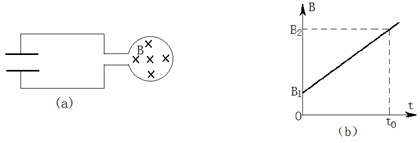 4、选择题 如图(a)所示,电路的左侧是一个电容为C的电容器,电路的右侧是一个环形导体,环形导体所围的面积为S。在环形导体中有一垂直纸面向里的匀强磁场,磁感应强度的大小随时间变化的规律如图(b)所示,则在0~t0时间内电容器(? )