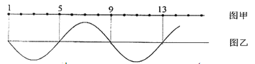 3、选择题  (5分)如图甲所示,某均匀介质中各质点的平衡位置在同一条直线上,相邻两点间距离为d。质点1开始振动时速度方向竖直向上,振动由此开始向右传播。经过时间t,前13个质点第一次形成如图乙所示的波形.关于该波的周期与波长说法正确的为