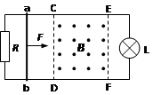 4、计算题 如图所示,水平面上有两电阻不计的光滑金属导轨平行固定放置,间距d为0.5 m,左端通过导线与阻值为2 W的电阻R连接,右端通过导线与阻值为4 W的小灯泡L连接,在CDEF矩形区域内有竖直向上的匀强磁场,CE长为2 m,CDEF区域内磁场的磁感应强度B随时间变化如图所示,在t=0时,一阻值为2 W的金属棒在恒力F作用下由静止开始从ab位置沿导轨向右运动,当金属棒从ab位置运动到EF位置过程中,小灯泡的亮度没有发生变化,求: