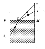 5、选择题 如图所示,容器中盛有水,PM为水面,从A点发出一束白光,射到水面上的O点后,折射光发生了色散照到器壁上a、b之间,对应a、b两种颜色的单色光,则 ( )