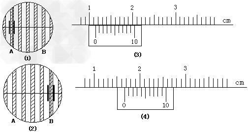 3、实验题 某同学在做“用双缝干涉测光的波长”实验时,第一次分划板中心刻度线对齐A条纹中心时,游标卡尺的示数如图(3)所示,第二次分划板中心刻度线对齐B条纹中心时,游标卡尺的示数如图(4)所示,已知双缝间距为0.5mm,从双缝到屏的距离为1m,则图(3)中游标卡尺的示数为?mm.图(4)游标卡尺的示数为?mm.实验时测量多条干涉条纹宽度的目的是?,所测光波的波长为?m.(保留两位有效数字)