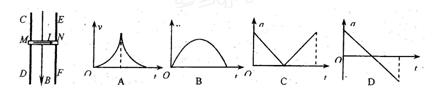 2、选择题 如图所示,在 竖直向下的匀强磁场中有两根竖直放置的平行粗糙导轨CD、EF,导轨上放有一金属棒MN。现从t=0时刻起,给棒通以图示方向的电流且电流强度与时间成正比,即d=kt,其中k为常量,金属棒与导轨始终垂直且接触良好。下列关于棒的速度V、加速度a随时间t变化的关系图象,可能正确的是(?)