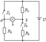 3、计算题 如图所示的电路中,R1=3Ω,R2=9Ω,R3=6Ω,电源电压U=24V保持不变。当开关S1、S2均开启和均闭合时,灯泡L都同样正常发光。
