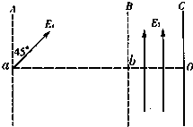 4、简答题 如图所示,AB间存在方向与竖直成45°角斜向上的匀强电场E1,BC间存在竖直向上的匀强电场E2,AB间距为0.2m,BC间距离为0.1m,C为荧光屏,质量m=1.0×10-3kg,电量q=+1.0×10-2C的带电粒子由a点静止释放,恰好沿水平方向经过b点到达荧光屏的O点,若在BC间再加方向垂直纸面向外大小B=1.0T的匀强磁场,粒子经b点偏转到达荧光屏的O′点(未画出).取g=10m/s2.求: