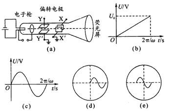 C.如果在偏转电极YY"上加如图(c)所示U=Umsinωt的电压,同时在偏转电极XX"上加如图(b)所示的电压,应观察到一条正弦曲线如图(e)