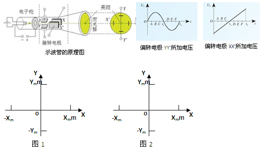 ②若偏转电极XX’加图示电压,同时偏转电极YY’所加图示电压,则在荧光屏上出现______.请在直角坐标系中定性画出条纹形状.