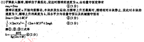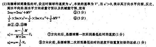 2、计算题 如图所示,一木块位于光滑的水平桌面上,木块上固定一支架,木块与支架的总质量为M.一摆球挂于支架上,摆球的质量为m,