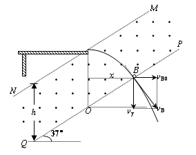 1、计算题 如图所示,光滑的绝缘平台水平固定,在平台右下方有相互平行的两条边界MN与PQ,其竖直距离为h=1.7m,两边界间存在匀强电场和磁感应强度为B=0.9T且方向垂直纸面向外的匀强磁场,MN过平台右端并与水平方向呈θ=37°.在平台左端放一个可视为质点的A球,其质量为mA=0.17kg,电量为q=+0.1C,现给A球不同的水平速度,使其飞出平台后恰好能做匀速圆周运动.g取10m/s2.