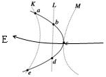 4、选择题  图中K、L、M为静电场中的三个相距较近的等差等势面.一带电粒子射入此静电场中后,依a→b→c→d→e轨迹运动.已知φK<φL<φM,且下列说法中正确的是(  )